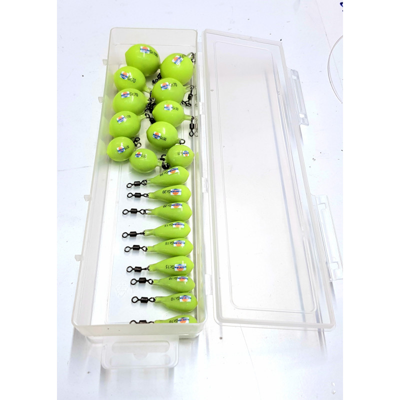 Serie di piombi con girella incorporata, copertura in gomma fluorescente. Nelle grammature da 70 e 200 comprensivi di sgancio rapido.