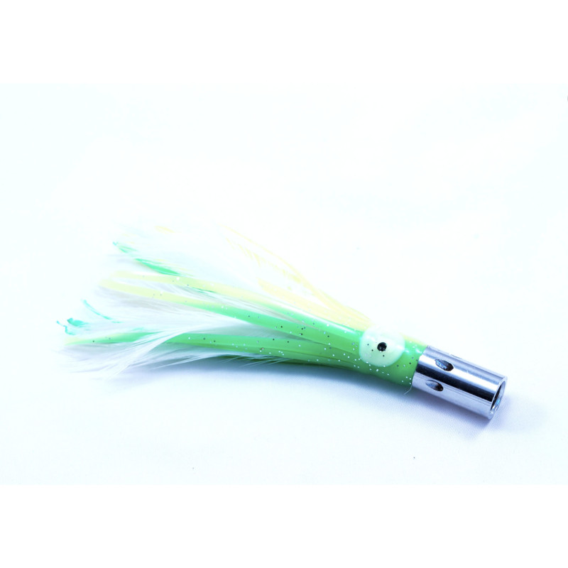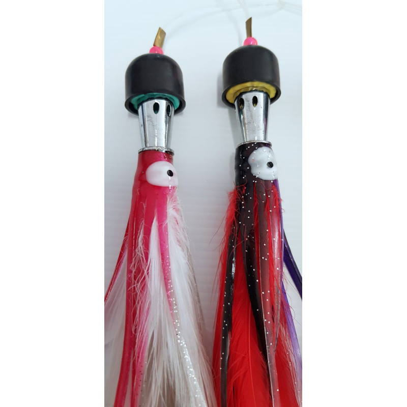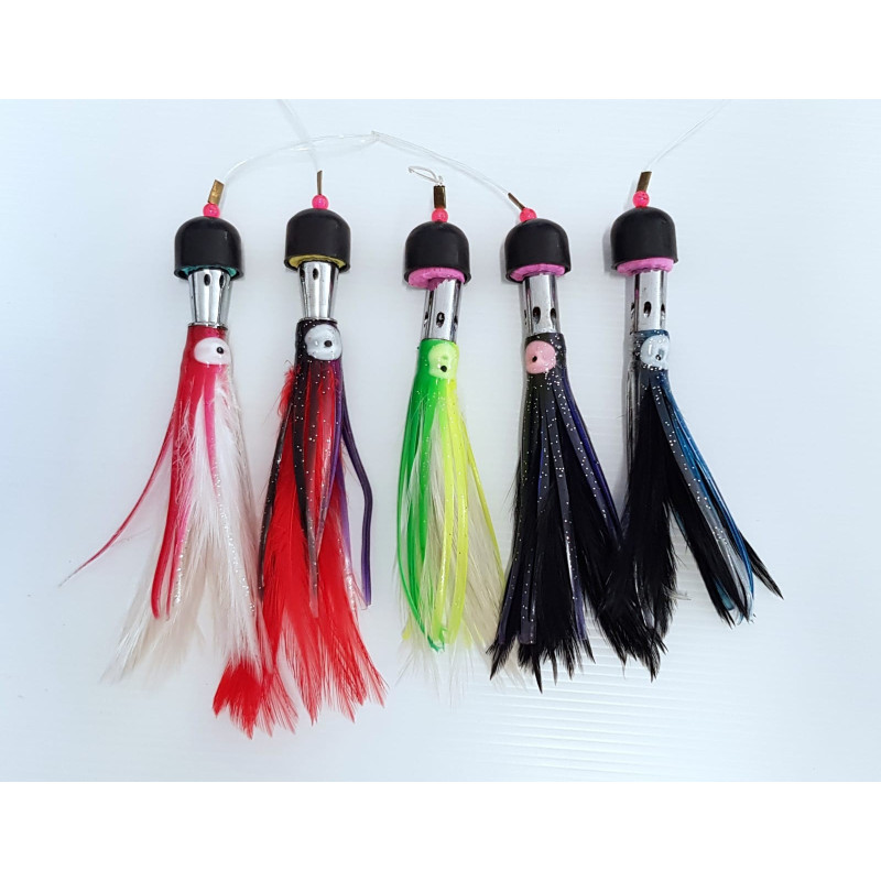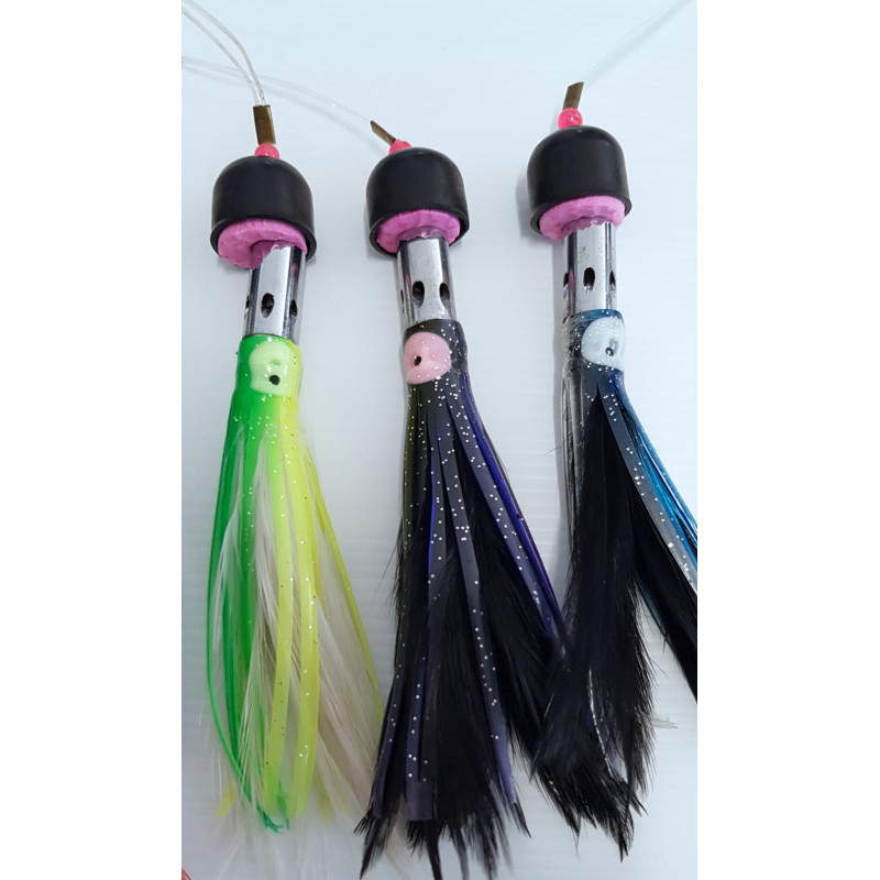 La Leggendaria Mediterranean Jet series e apprezzata da un ampio spettro di predatori. Hanno tre tipi di testa, a cono rovesciato; a cilindro; o svasate anteriormente. Tutte e tre le tipologie delle Teste presentano fori idrodinamici studiati per consentire turbolenze ideali per l’acqua salata. L’Inclinazione dei fori in Testa, riesce a far emettere in Azione di pesca dei suoni e delle turbolenze tali da scaturire l’attacco di ogni tipo si Predatore Marino.La composizione della testa e totalmente in Acciaio Inox, abbinata a octopus e Piuma, sia nelle versioni big size che small size.